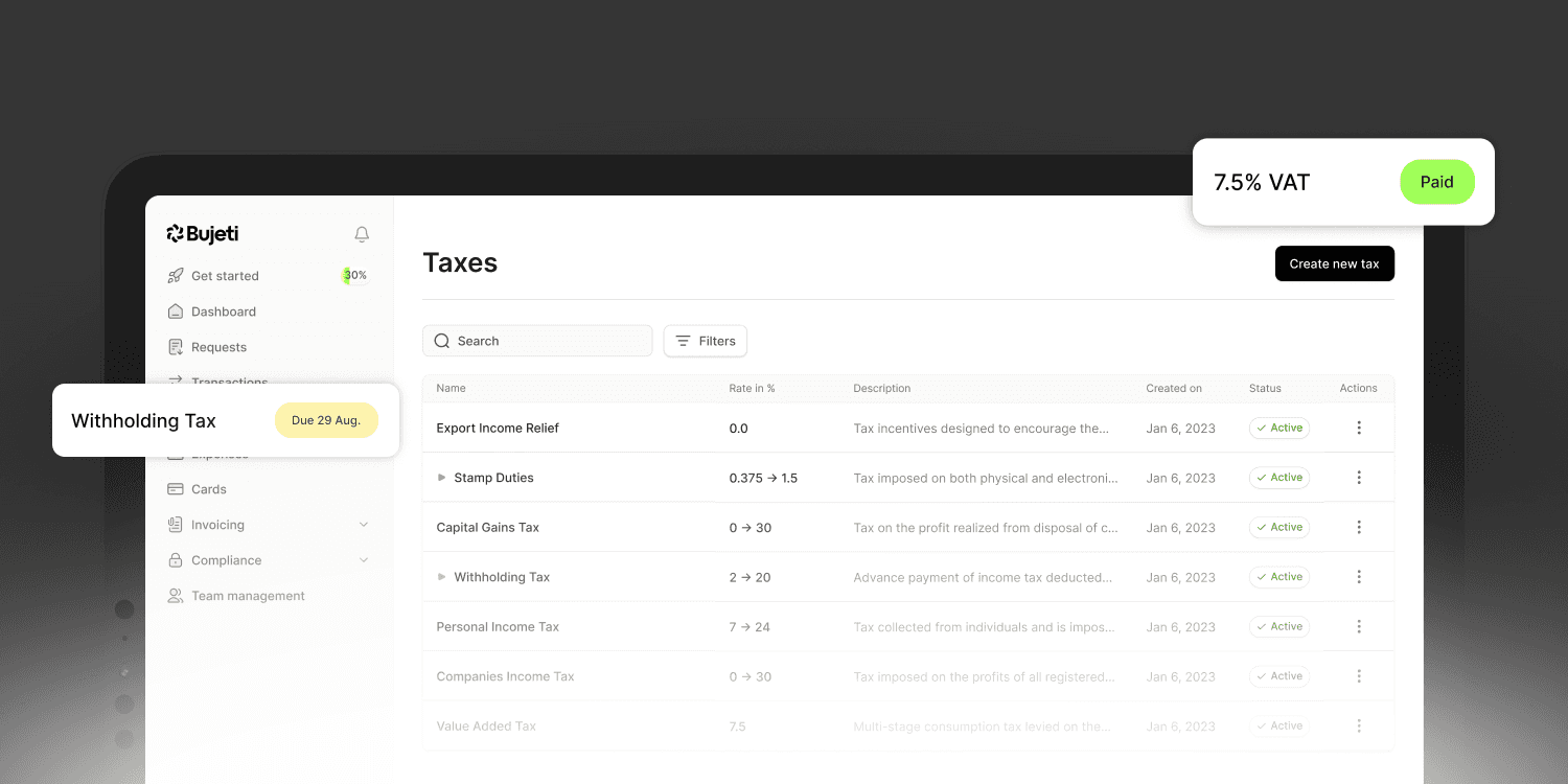 Bujeti doesn’t assume tax equals payment; we put tax compliance under your control