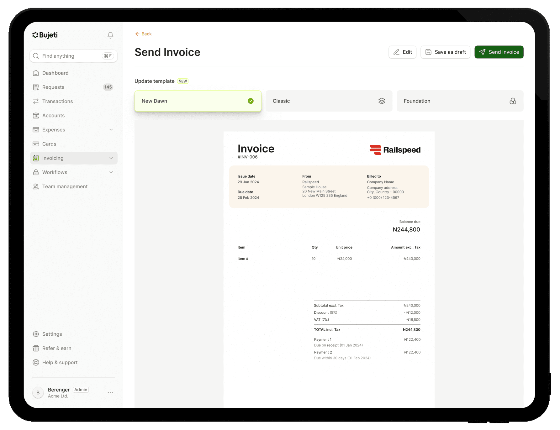 Track invoices in real time from one dashboard. Set terms once; Bujeti automates payment reminders for timely collection, no chasing.